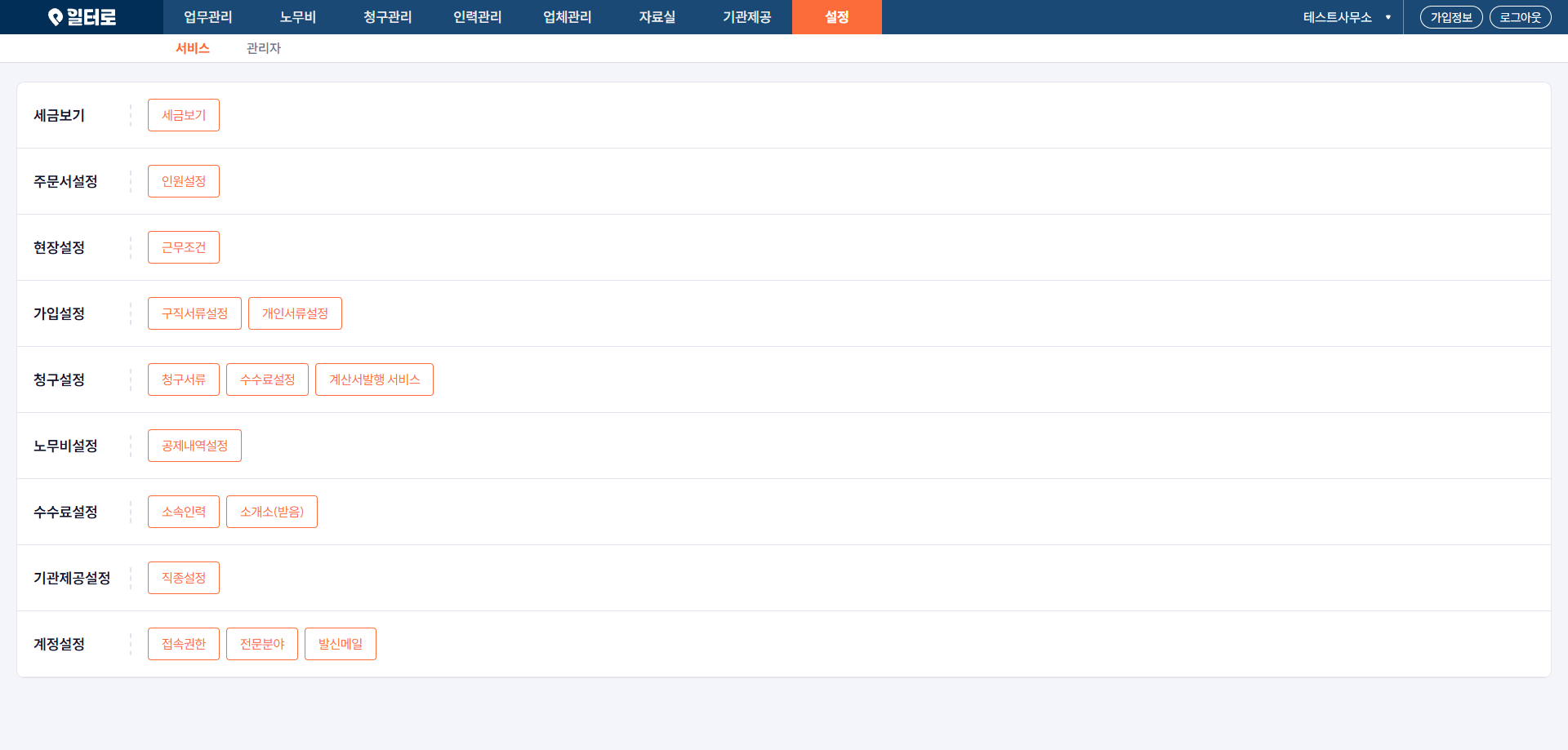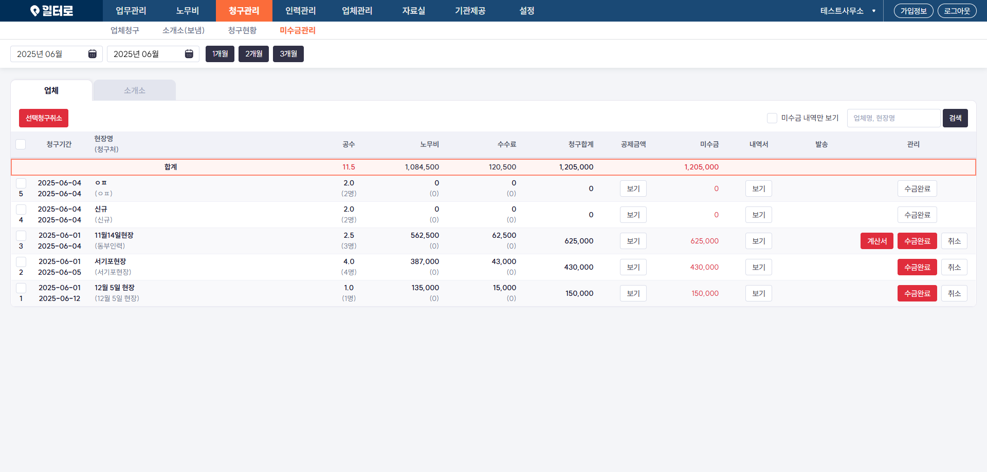- 기간별 현장(거래처) 노무비/수수료/추가지급 청구관리, 제출서류 등록 및 확인, 청구서 발송 가능