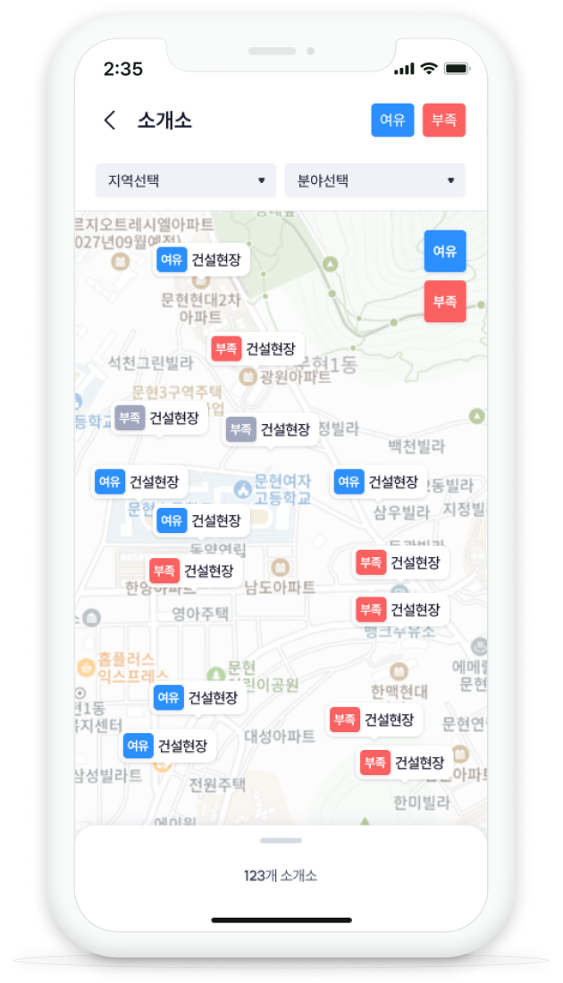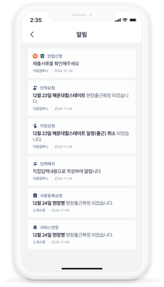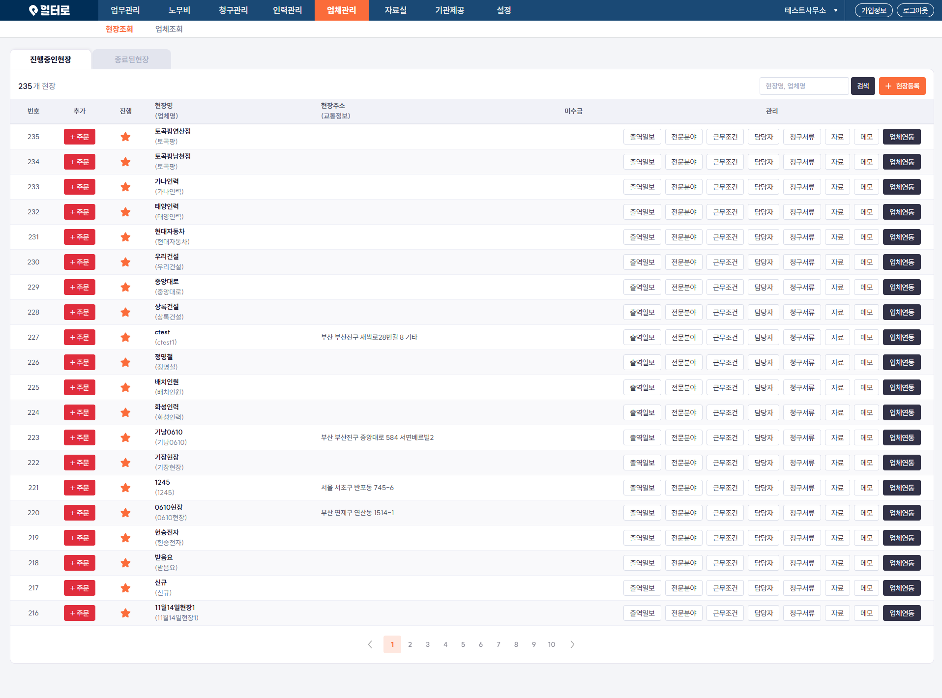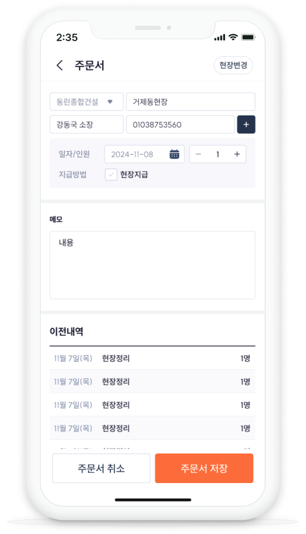 - 현장별 인력투입 요청 가능, 미처리/처리완료 현황 파악