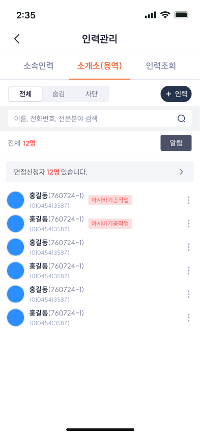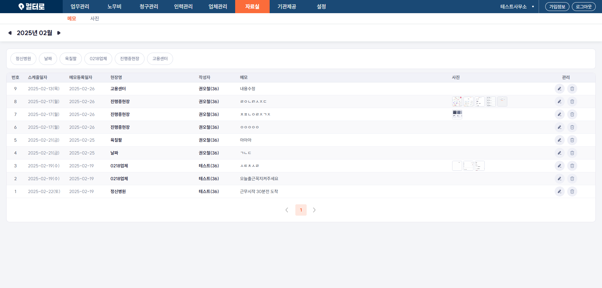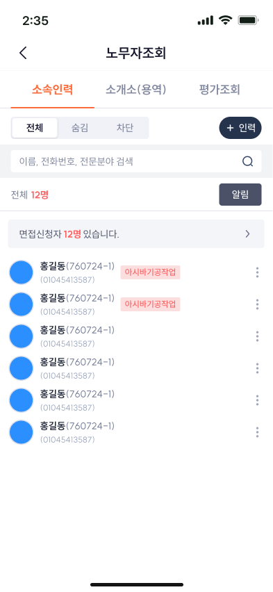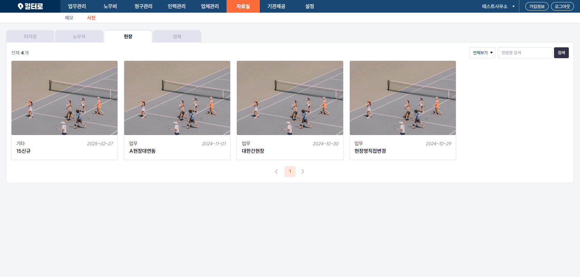 - 현장별 인력투입 요청 가능, 미처리/처리완료 현황 파악