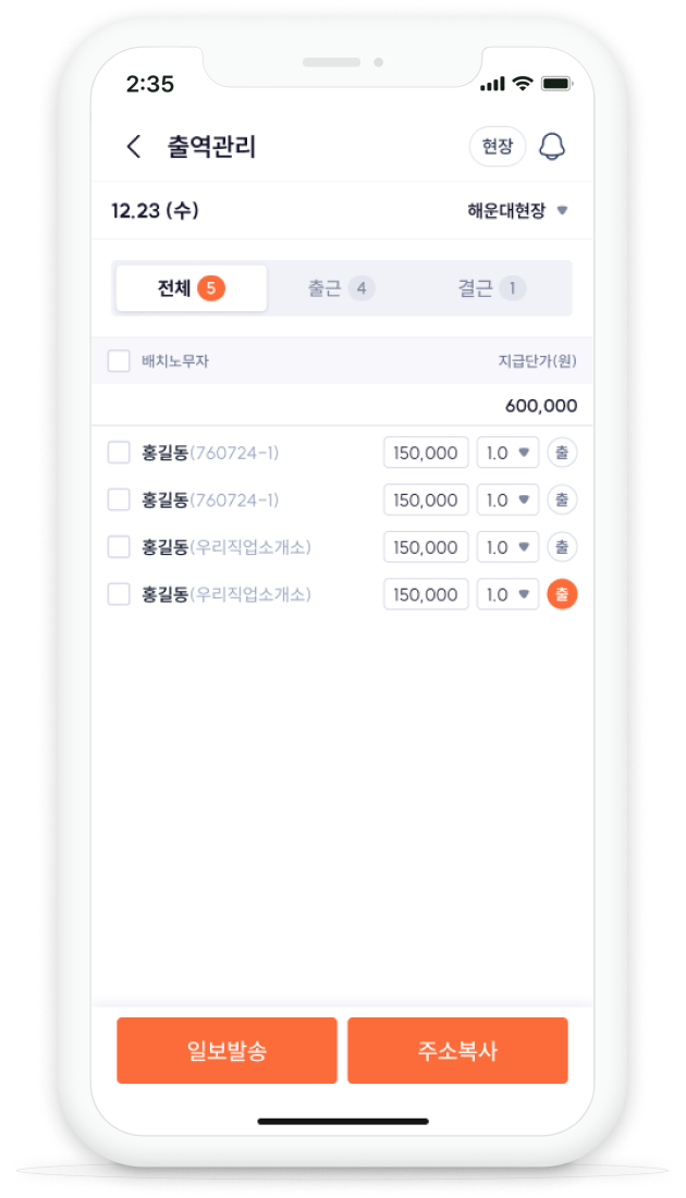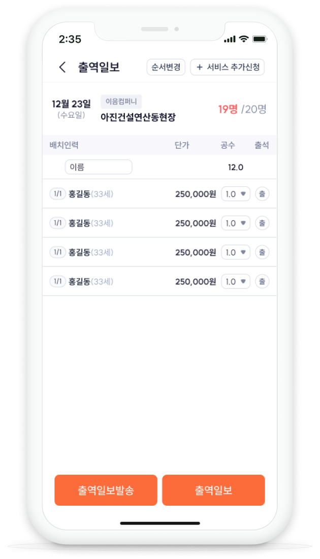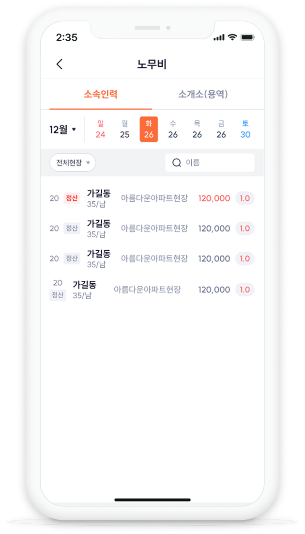 - 일별 필요한/배치가능한 인력 파악,현장별 전체 노무비 확인