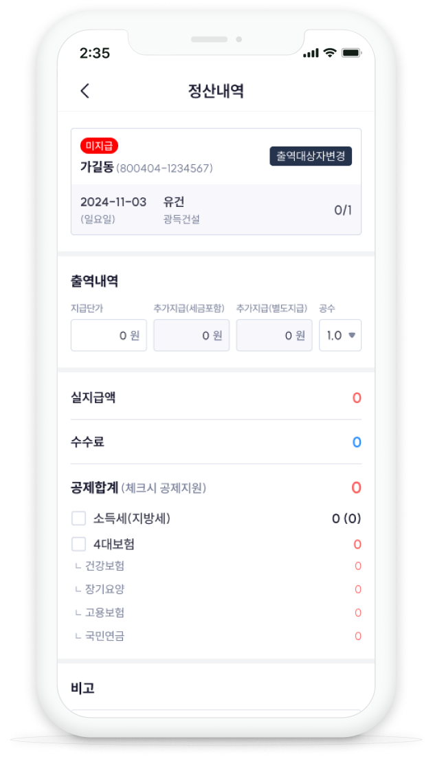 - 일별/개인별 노무비/수수료/보험료/지급방법과 처리일자 확인